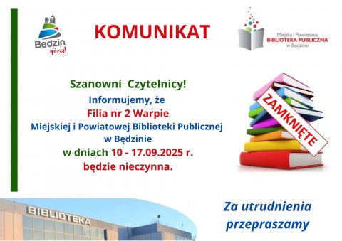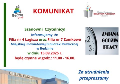 15 WRZ Komunikat dot. pracy Filii nr 4 - Łagisza oraz Filii nr 7 - Zamkowe w dniu 15 września br. Za utrudnienia przepraszamy.