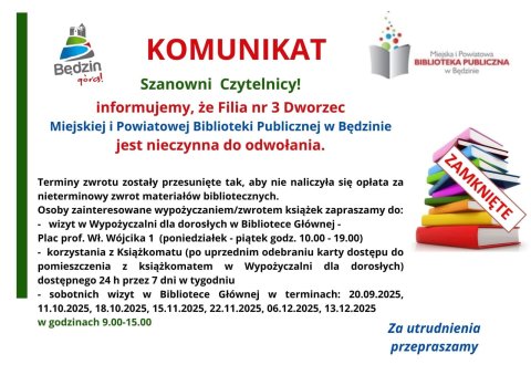 15 WRZ Komunikat dot. pracy Filii nr 3 - Dworzec - filia nieczynna do odwłonia Za utrudnienia przepraszamy.