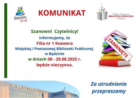28 LIP Komunikat dot. pracy Filii nr 5 - Grodziec w okresie 28.07 - 14.08.2025 r Za utrudnienia przepraszamy.