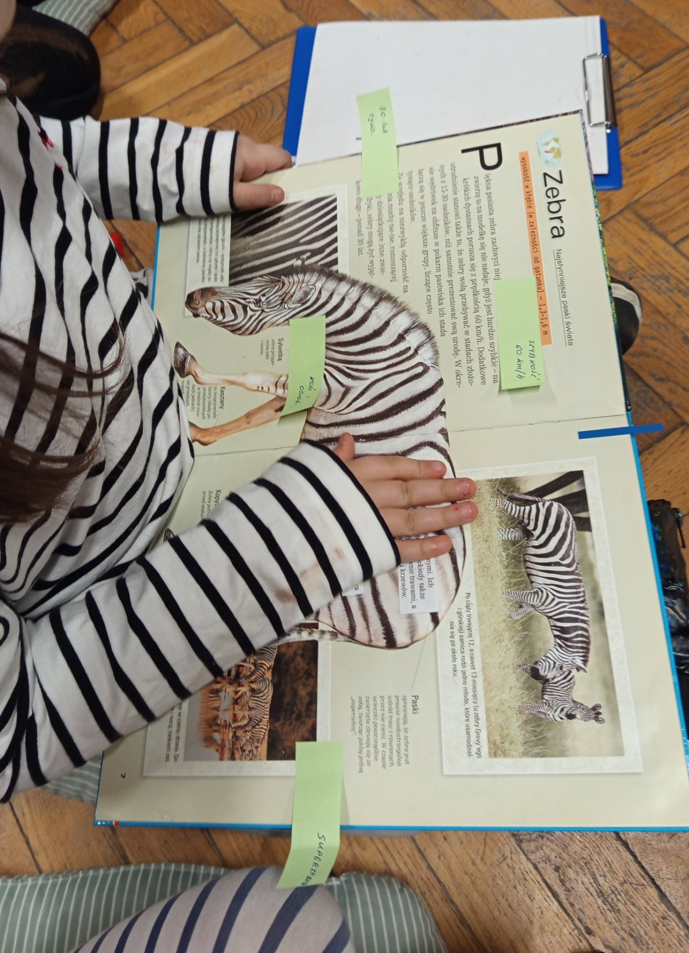 Fakty i ciekawostki: Dzięki książce Danuty Ciszak dowiedzieliśmy się, że zebra to niezła sportsmenka – biega z prędkością 60 km/h! Poznaliśmy też tajemnicę „superzebry”. Odrobina uśmiechu: Rozbawił nas wiersz Ludwika Jerzego Kerna o pasiastej miłości do konia. Nauka przez zabawę: Kasia Stoparczyk wyjaśniła nam, z czego właściwie biorą się czarno-białe paski. Nie zapomnieliśmy o bezpieczeństwie! Nasze przedszkolaki to eksperci od przechodzenia przez „zebrę” na pasach. Na pamiątkę tego spotkania dzieci własnoręcznie przygotowały urocze zakładki do książek.