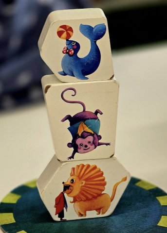 skomplikowane układy akrobatyczne, wykorzystując do tego drewniane klocki przedstawiające postaci akrobatów.