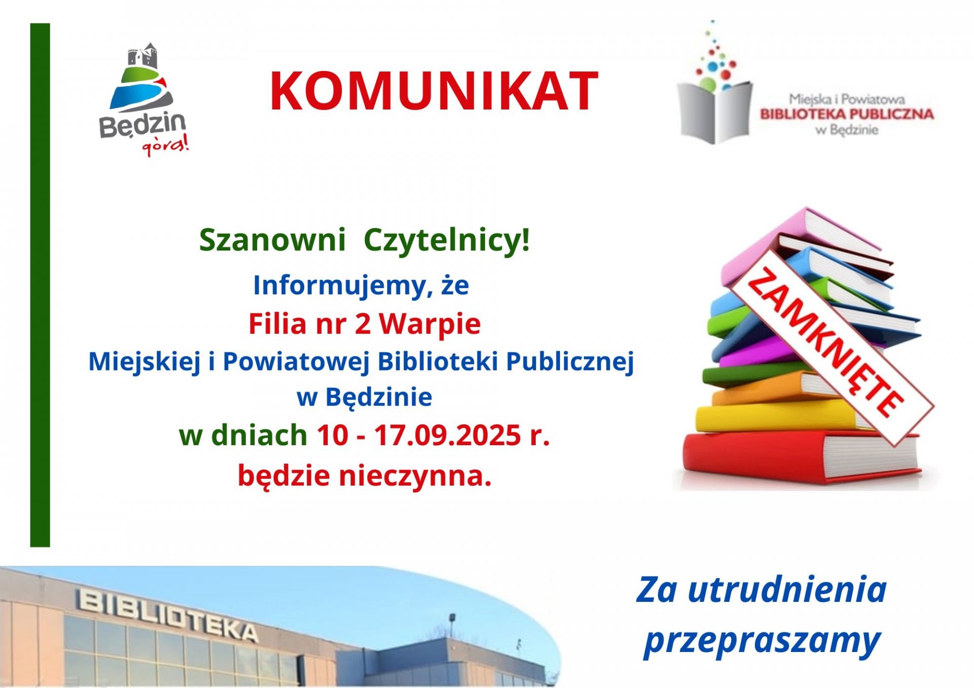 informujemy, że Filia nr 2 Warpie w okresie 10.09.2025 r. - 17.09.2025 r. będzie nieczynna.