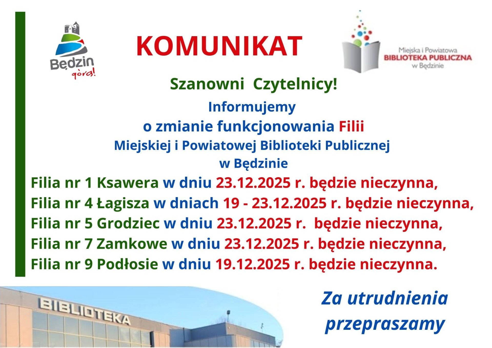 Informujemy, że Filia nr 1 - Ksawera, Filia nr 4 - Łagisza, Filia nr 5 - Grodziec oraz Filia nr 7 - Zamkowe w dniu 23 grudnia będą nieczynne. Za utrudnienia przepraszamy.
