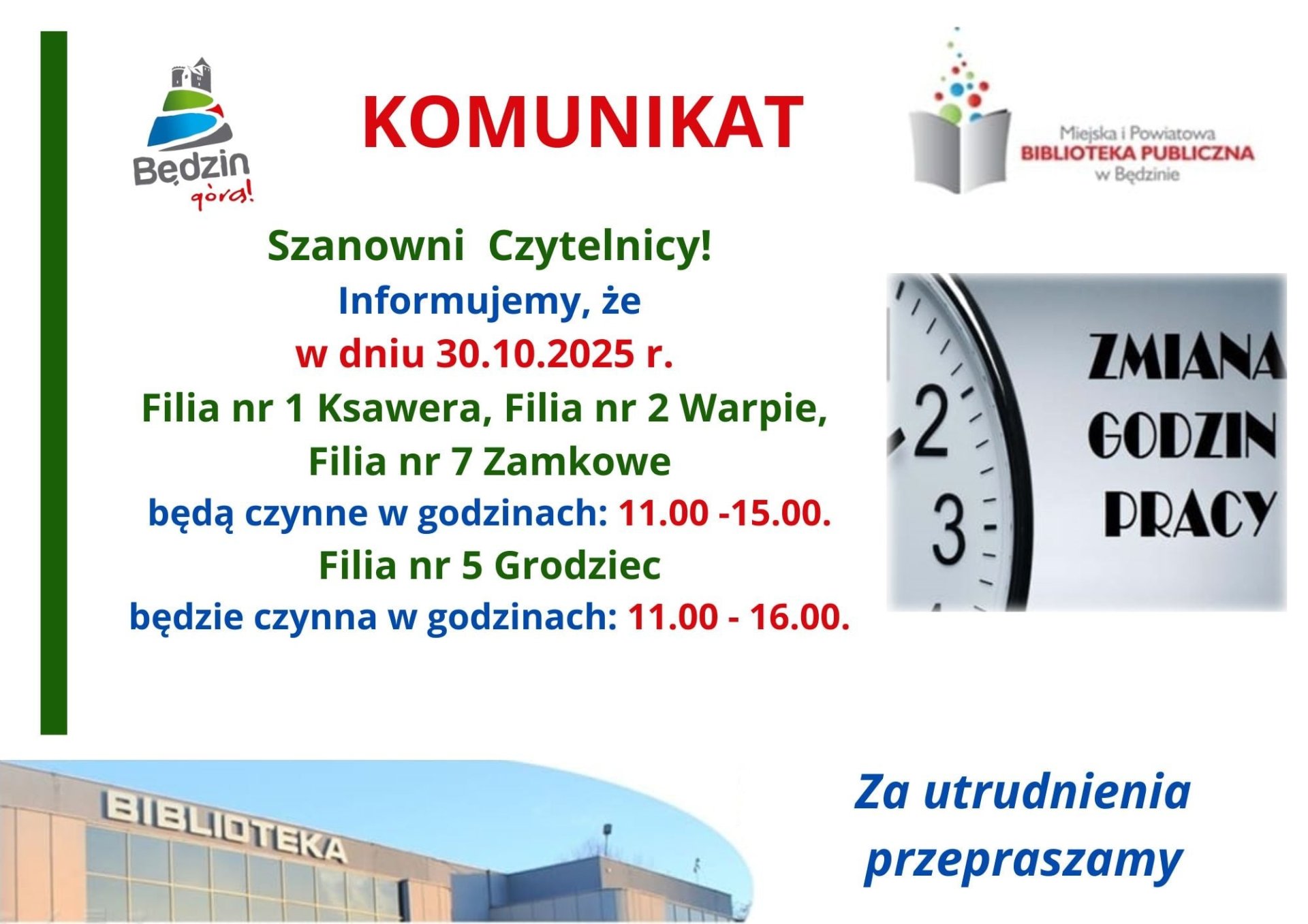 Komunikat dot. pracy Filii bibliotecznych w dniu 30.10.2025 r.