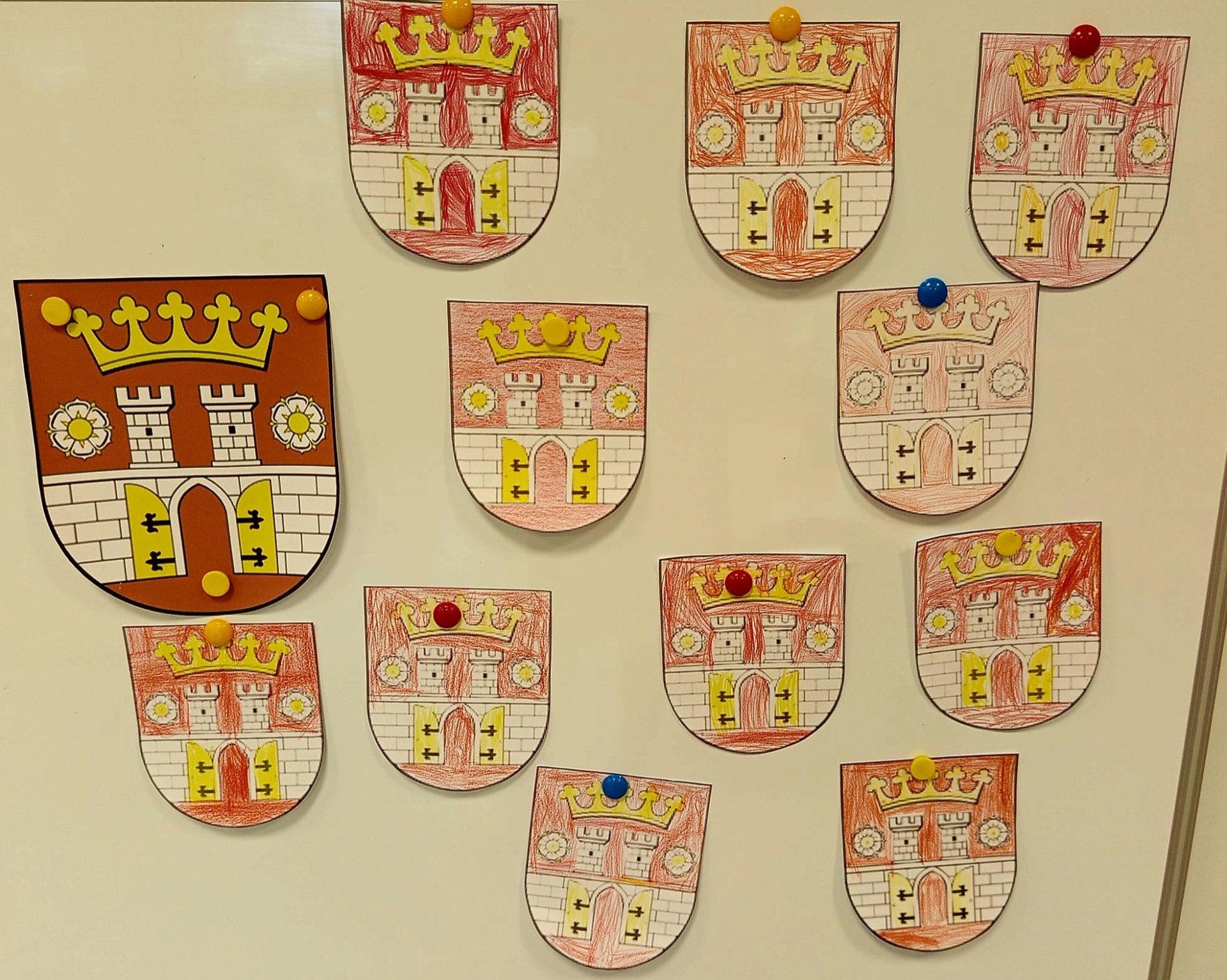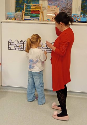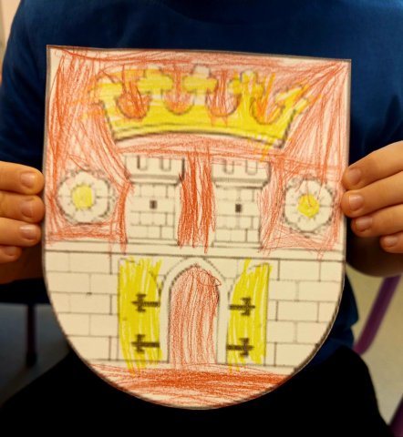 Zajęcia zakończyły się warsztatem plastycznym, podczas którego przedszkolaki wykonały własne interpretacje herbu Będzina utrwalając tym samym wiedzę na temat symboli lokalnej tożsamości.