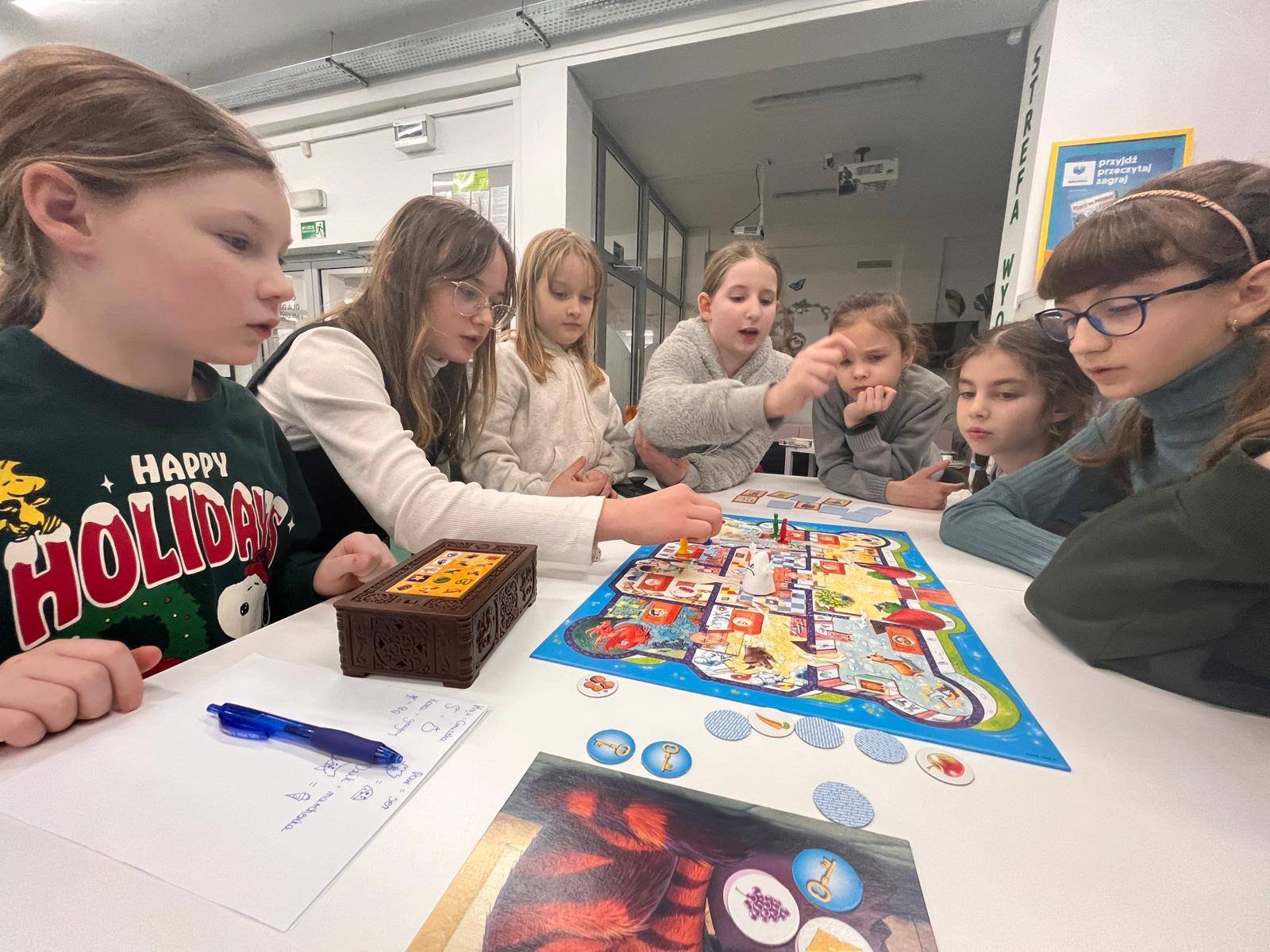 To interaktywna gra, w której nasze uczestniczki wcieliły się w detektywów, by zdjąć zły urok z królestwa i odnaleźć złodzieja królewskiego klejnotu. Zadanie nie było proste. W trakcie kooperacyjnej rozgrywki uczestnicy spotkania przemieszczali się po wybranych komnatach, rozmawiali ze zwierzętami, które chętnie udzielały porad za odpowiednie przysmaki oraz poszukiwali kluczy, dzięki którym mogli otworzyć skrzynie podejrzanych. W tym wszystkim przeszkadzał im zły czarodziej, duch przeganiający ich przez całą posiadłość oraz uciekający czas. Nasze detektywki w wielkich emocjach rozegrały dwie tury, które zakończyły się wielkim sukcesem.