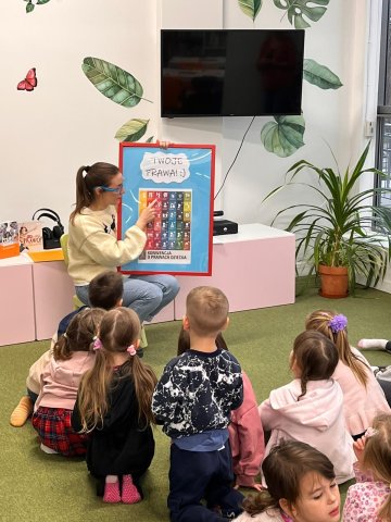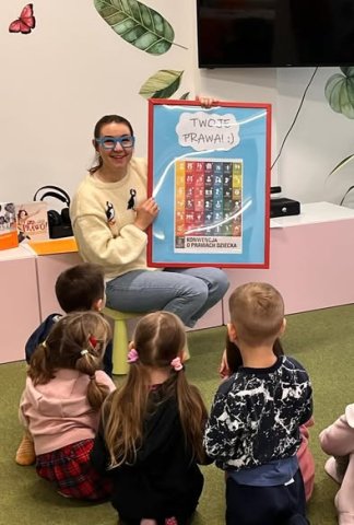 W oparciu o materiały przygotowane przez UNICEF oraz książki Grzegorza Kasdepki i Janusza Korczaka, rozpoczęli rozmowę o prawach, które przysługują każdemu dziecku. Mówili o zapewnieniu bezpieczeństwa, ochrony, miłości oraz warunków do rozwoju. W spotkaniu towarzyszyły dzieciom również niebieskie okulary, które są symbolem pozwalającym dostrzegać każde z praw.