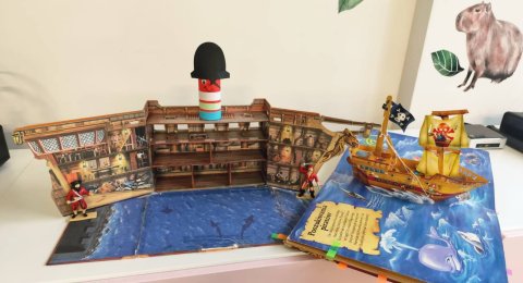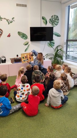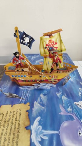 Przedszkolaki odwiedziły Oddział dla dzieci i młodzieży, gdzie czekała na nich wyprawa po skarb. Wspaniałym przewodnikiem po świecie piratów okazała się książka „Przewodnik podróżnika - Piraci”. Dzięki niej przedszkolaki dowiedziały się, jak zostać odważnym piratem, a z pomocą starej mapy wyruszyły na poszukiwania ukrytego skarbu. Sprawdziły też, co widać przez piracką lunetę! Statek "Parszywy Poranek" pomógł im w wyprawie, a do szczęśliwego finału doprowadziła magiczna książka.Podczas zajęć przedszkolaki wcieliły się w prawdziwych poszukiwaczy skarbów, a przy wsparciu cennych wskazówek z książki stworzyły fantastycznych piratów.