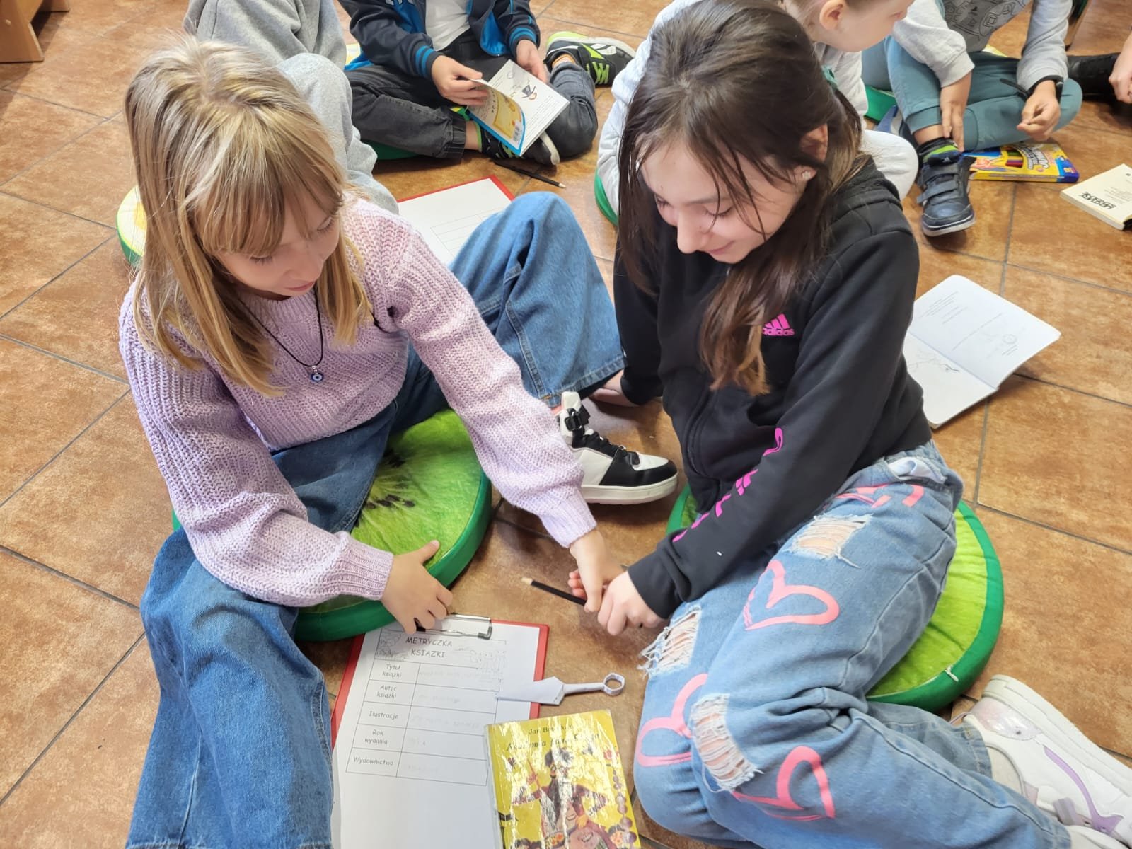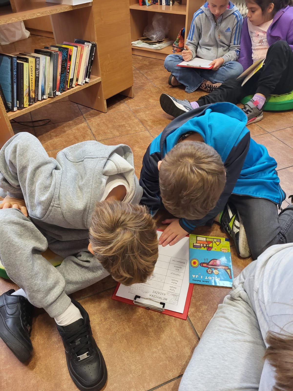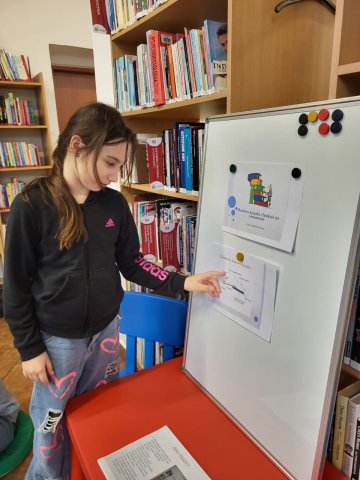 Aby utrwalić zdobytą wiedzę, uczniowie otrzymali zadanie praktyczne – musieli wypełnić metryczkę książki. Do wybranej przez bibliotekarkę lektury należało wskazać: tytuł, autora, ilustratora, rok wydania oraz wydawnictwo.