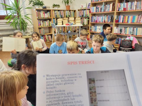 Podczas zajęć dzieci dowiedziały się, jak zorganizowana jest książka, jakie elementy wchodzą w jej strukturę oraz które z nich są niezbędne, aby mogła powstać. Poznały m.in. czym jest okładka, strona tytułowa, spis treści, numeracja stron, ilustracje, rozdziały oraz stopka redakcyjna. Dzięki temu uczniowie zrozumieli, że książka to nie tylko tekst, lecz także starannie zaplanowana całość, w której każdy element ma swoją funkcję – ułatwia korzystanie z treści i czyni lekturę bardziej atrakcyjną.