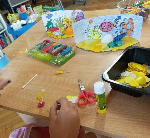 Podczas kolejny wakacyjnych zajęć w filii nr 1 Ksawera zaproponowaliśmy temat "Zatopione" - czyli o tym, co znajduje się pod wodą, zarówno tym, co na dnie kryje się od zawsze, ale i o tym, co uległo zatopieniu. W książce Aleksandry i Daniela Mizielińskich pt. "Pod wodą" można znaleźć informacje o najgłębszej znanej głębi Ziemi czyli o Rowie Mariańskim oraz o wraku Titanica. Opisuje ona także rafę koralową, która była tematem dzisiejszej pracy plastycznej. Rafa jest niezwykle różnorodna, a bogactwo tworzących ją i żyjących dookoła organizmów jest niezwykle fascynujące. O powstaniu rafy i ciekawostkach z nią związanych wiele można dowiedzieć się z książki Krzysztofa Teisseyre pt. "Rafa koralowa", która należy do serii "Tajemnice zwierząt". Wykorzystując rozmaite materiały plastyczne i dodatki tj. styropian, kreatywne druciki, masę papierową i cekiny można dziś było przygotować własną makietę rafy koralowej.