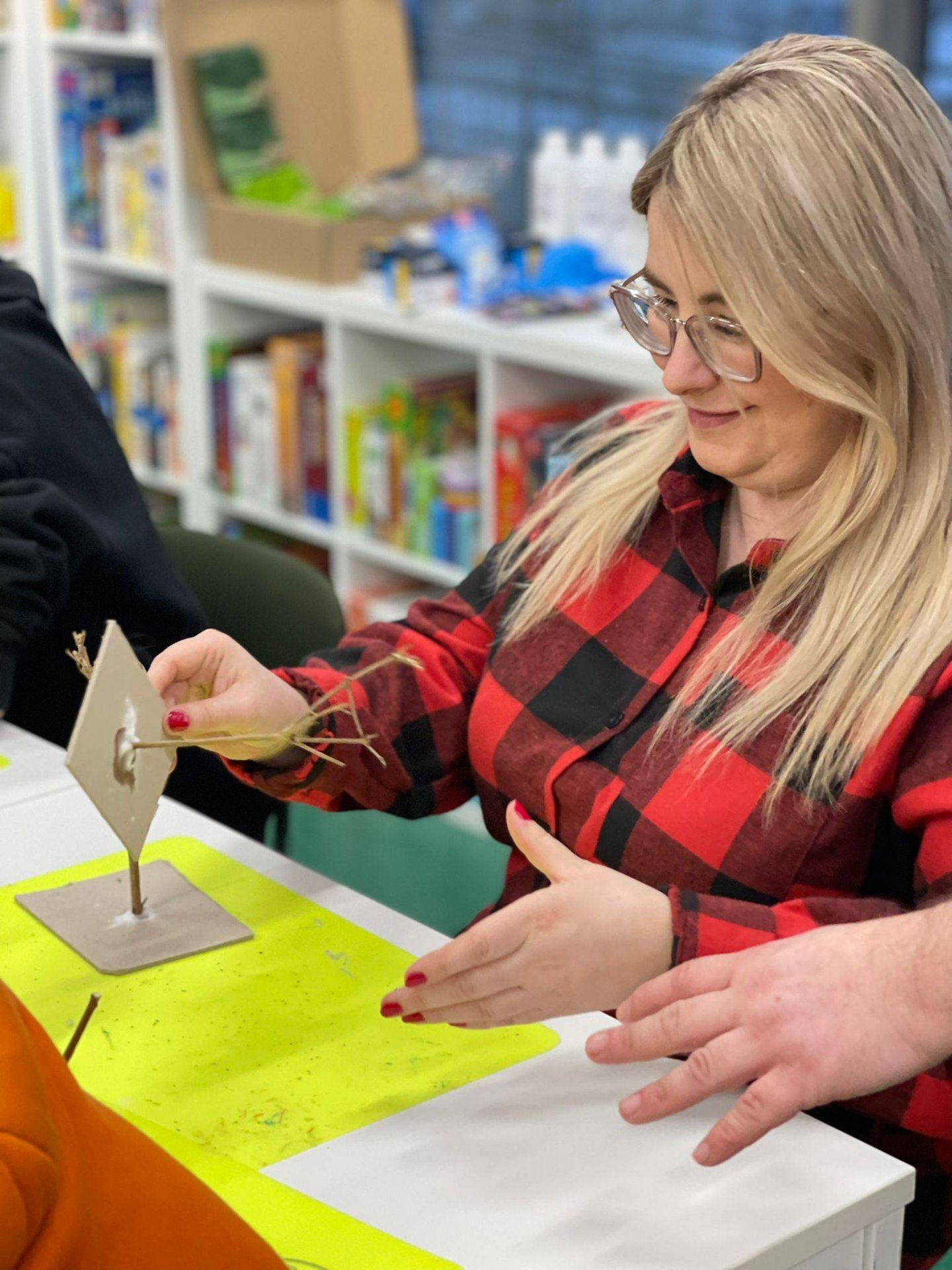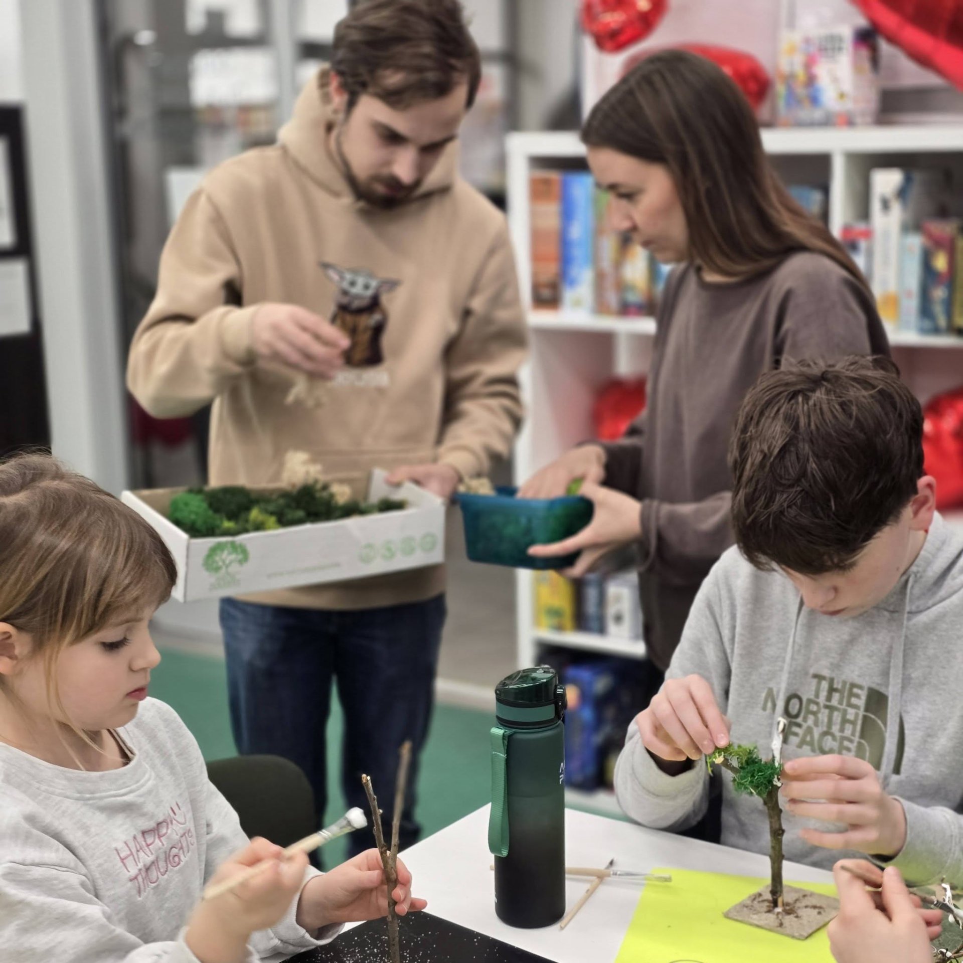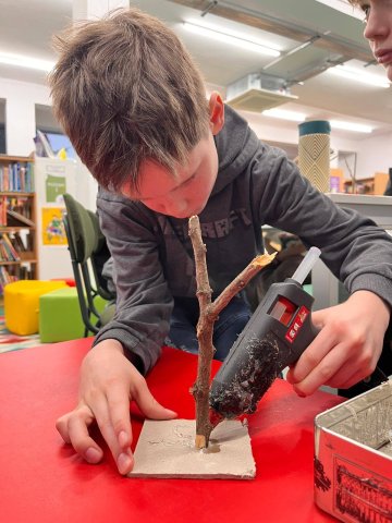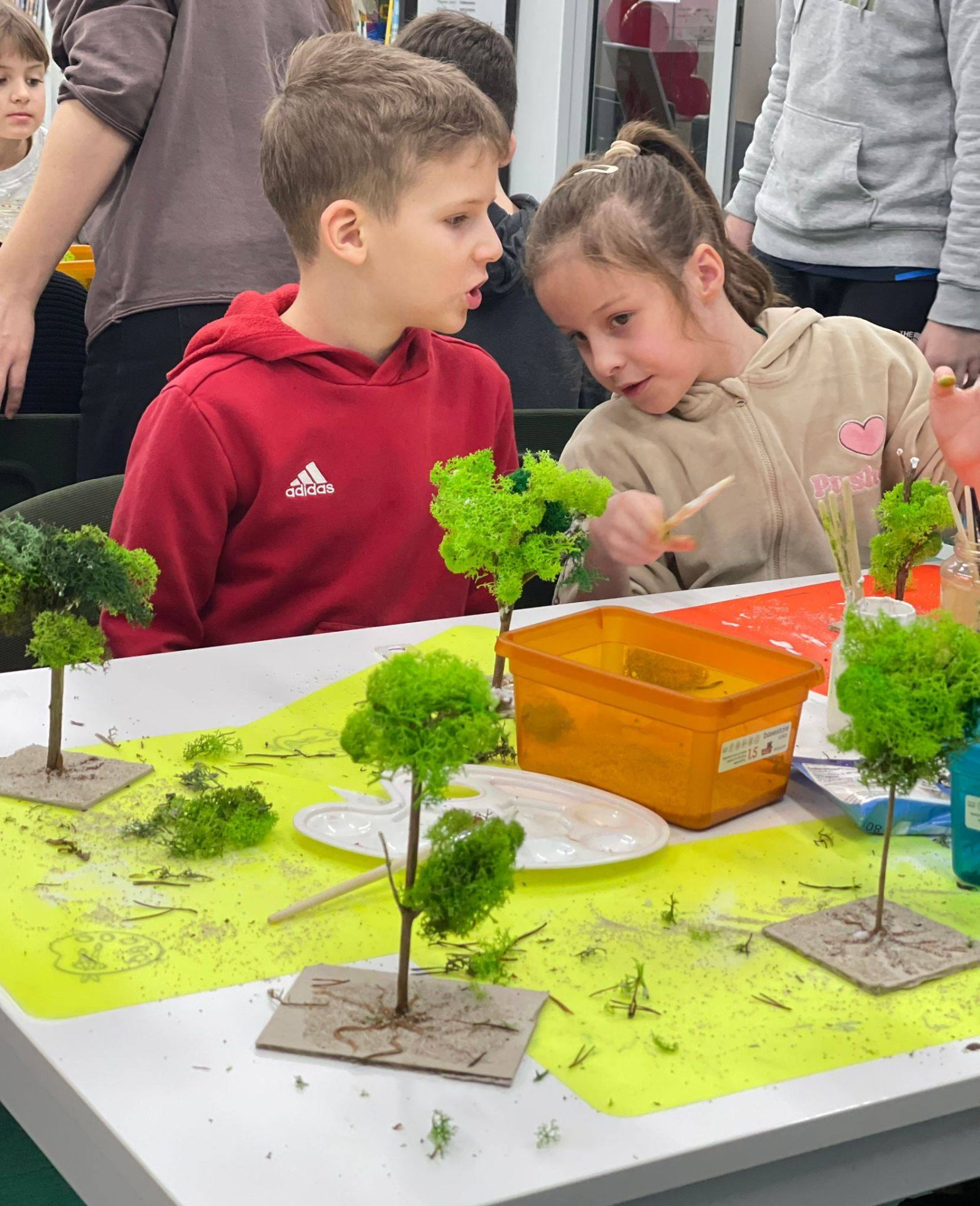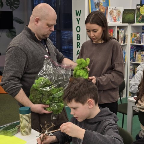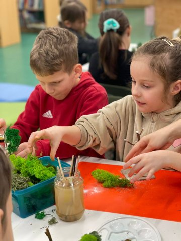Uczestnicy z wielkim zaangażowaniem konstruowali miniaturowe drzewa i krzewy. Budowa wymagała ogromnego skupienia, cierpliwości i niemałej precyzji, ale młodzi twórcy poradzili sobie z tym wyzwaniem śpiewająco. Mimo ambitnego zadania, w sali nie brakowało zabawy i głośnego śmiechu, szczególnie podczas formowania puszystego chrobotka. Wspólna praca stała się też doskonałą okazją do integracji i wzajemnej pomocy przy trudniejszych elementach konstrukcji.