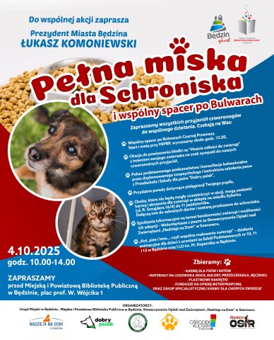 Zapraszamy wszystkich mieszkańców Będzina, a w szczególności Czytelników Miejskiej i Powiatowej Biblioteki Publicznej w Będzinie na akcję „Pełna Miska dla Schroniska”