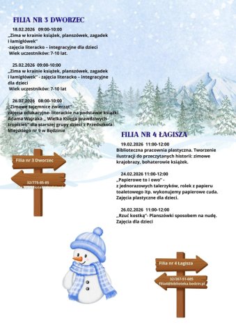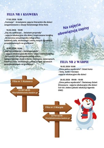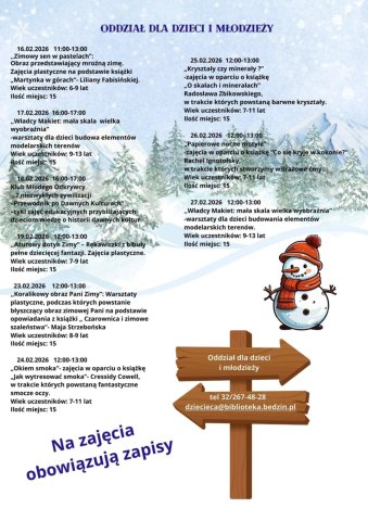 Miejska i Powiatowa Biblioteka Publiczna w Będzinie zaprasza dzieci na wyjątkowe ferie „Zima pełna wyobraźni”. Przygotowaliśmy bogaty program zajęć, które odbywać się będą w Oddziale dla dzieci i młodzieży - obowiązują zapisy oraz filiach biblioteki.