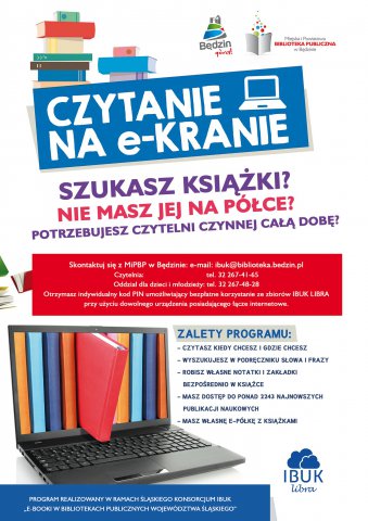Realizując projekt biblioteka oferuje użytkownikom bezpłatny dostęp do bazy ponad 2000 publikacji. Duża część elektronicznego księgozbioru to literatura naukowa i popularnonaukowa adresowana do osób uczących się i dokształcających. Poza tym wśród e-książek dostępne są publikacje z zakresu literatury faktu, literatury pięknej, literatury dla dzieci i młodzieży oraz poradniki, słowniki i kompendia wiedzy. Aby skorzystać z e-booków w serwisie libra.ibuk.plwystarczy być czytelnikiem będzińskiej biblioteki. W ramach drugiej edycji akcji, która w będzińskiej książnicy realizowana jest w ramach programu "CZYTANIE na e-KRANIE", każdy zainteresowany ofertą czytelnik otrzyma indywidualny kod PIN, umożliwiający nieodpłatny i całodobowy dostęp do oferowanych wydawnictw.